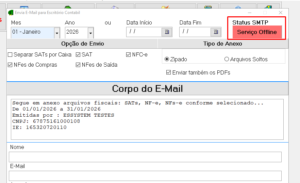 - Opção de Envio: Você vai marcar para enviar as NFC-e, Notas de Saída e Notas de Entrada, verifique também se a opção Enviar os PDFs está marcada. A opção do SAT você vai marcar apenas caso tenha emitido algum cupom SAT em Janeiro de 2026. Caso contrário, esse campo deve ficar sempre desmarcado, pois o SAT saiu de operação permanentemente a partir de 01/01/2026.